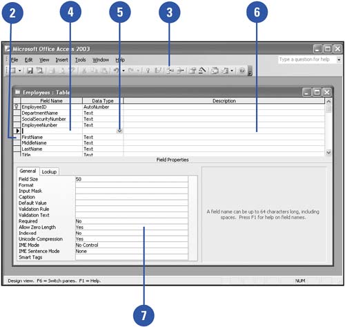 | In the Database window, click Tables on the Objects bar, click the table in which you want to insert a new field, and then click the Design button. |