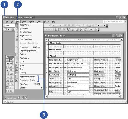 A fast way to format a form or report is with the AutoFormat button, available in Design view. When you click this button on the Form Design toolbar, you can select and preview a variety of layouts and styles. After you make your selections, Access formats the entire report or form consistently for you. After using AutoFormat, you can always make additional changes to the formatting using buttons on the Formatting (Form/Report) toolbar. If you don't see the header and footer sections, you can display them to add controls. When you select a control, sizing handles appear around the control, which you can drag to size it. You can also drag inside a selected control to move it to a new location.