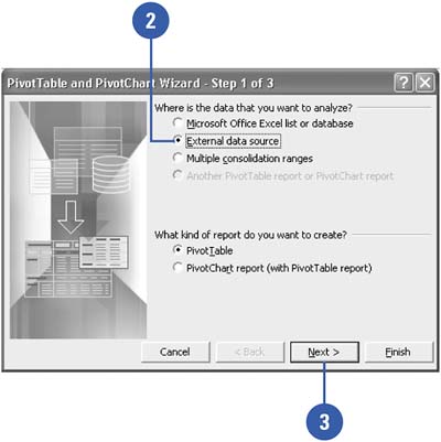 | In Excel, click the Data menu, and then click PivotTable And PivotChart Report. |