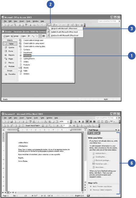 Access is a great program for storing and categorizing large amounts of information. You can combine, or merge, database records with Word documents to create tables or produce form letters and envelopes based on names, addresses, and other Access records. For example, you might create a form letter in Word and personalize it with an Access database of names and addresses. Word uses the Mail Merge task pane to step you through the process. Mail merge is the process of combining names and addresses stored in a data file with a main document (usually a form letter) to produce customized documents.