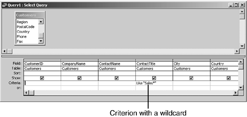 | Access displays the word Like in the criteria cell before a wildcard criterion. It is not necessary to type the word Like in the criterion cell before the criterion. |