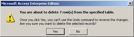 If you try to run the same Make Table query more than one time, Access permanently deletes the table with the same name as the table you're creating. (See the warning message in Figure 15.25.) Figure 15.25. The Make Table query warning message that is displayed when an existing table already has the same name as the table to be created.