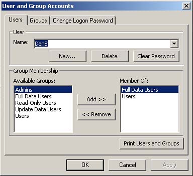 Figure 22.24 shows a user named DanB who has been added to the Full Data Users group. Figure 22.24. Assigning a user to the appropriate group.