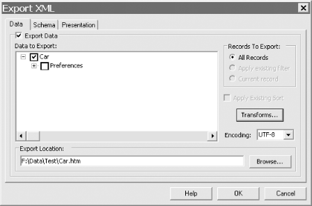 Recipe 18.5 Exporting Selected Columns to an HTML Table18.5.1 ProblemYou'd like to export data from a table as XML and display it in an HTML table. However, you only want to display selected columns from the table, not the entire table. 18.5.2 SolutionIf you wish to export data using only selected columns, you can do so with a query, but you can also accomplish this by using an XSLT transform. Using a transform has the added benefit of allowing you to format the data as HTML. Follow these steps to export only the Make and Model data from the Car table and to format the data as an HTML table: