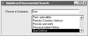 In this case, you'll be calling the acbDoSearchTable function, which searches through an indexed table instead of through an unindexed dynaset. In general, you'll call acbDoSearchTable with the following syntax: intRetval = acbDoSearchTable(textBox, listBox, "BoundField", "IndexName") where textbox is a reference to the text box in which you're typing, listbox is the list box in which you're searching, "BoundField" is the field in the list box's underlying record source through which you're going to search, and "IndexName" is the name of the index you're going to use. (Usually it'll just be "PrimaryKey," but in this example use "Company Name". This table is indexed both on the Customer ID field (the primary key) and the Company Name field; you're using the Company Name index.) The code for acbDoSearchTable is almost identical to that for acbDoSearchDynaset, except that the table search uses the Seek method to search through an indexed recordset instead of the FindFirst method. Because it can use the index, it should be able to find matches much more rapidly than acbDoSearchDynaset.