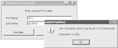 To see an example, copy the 06-05.MDB and 06-05Ext.MDB databases to a folder on your hard drive. The 06-05.MDB database is linked to the tblCustomers table in 06-05Ext.MDB. Code in frmRelink, the startup form in 06-05.MDB, takes care of relinking to the tblCustomer table in 06-05Ext.MDB (we explain this technique later in this chapter). Open the frmSeekExternal form from 06-05.MDB. Enter a first and last name for which to search (you may find it helpful to browse through tblCustomer first) and press the Use Seek command button (see Figure 6-8). Even though this table does not exist in the 06-05.MDB database, the row will be retrieved using the fast Seek method. Figure 6-8. The frmSeekExternal form![]() 6.5.3 DiscussionThe key to this technique is using the OpenDatabase method on the workspace object to open the external database directly where the linked table physically resides. The OpenDatabase method takes four parameters, which are detailed in Table 6-4.