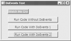As you can see from the second button on the sample form, recursively calling DoEvents can lead to trouble. You should take steps, as in the example of the third button, to make sure that this won't occur in your applications. |
