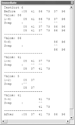 Recipe 7.7 Sort an Array in VBA7.7.1 ProblemAlthough it's a database product, Access doesn't include a way to sort an array. You need to present sorted arrays in an application, and you can't find a reasonable way to sort them without first saving them to a table. You know you've seen array-sorting methods in other languages. Can you write a sorting routine that executes quickly? 7.7.2 SolutionIt's true that Access doesn't provide a built-in sorting mechanism for arrays. Entire volumes in libraries are devoted to the study of various sorting and searching algorithms, but it's not necessary to dig too deep for array-sorting methods for Access. Because you'll probably place any large data sets into a table, most arrays in Access aren't very large. Therefore, almost any sort will do. This solution uses a variant of the standard quicksort algorithm. (For more information on various sorting and searching algorithms, consult your computer library. This is a big topic!) To try the sorting mechanism, load the module named basSortDemo in 07-07.MDB. From the Immediate window, type: TestSort 6 where the 6 can be any integer between 1 and 20, indicating the number of random integers between 1 and 99 that you want the routine to sort. The sample routine, TestSort, will create the array of integers and send it off to VisSortArray, a special version of the sorting routine acbSortArray that shows what it's doing as it works. Figure 7-11 shows the output from a sample session. Figure 7-11. The output from a sample run of TestSort![]() To use this sorting code in your own applications, follow these steps: