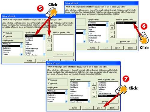 As you saw in step 5, the Sample Fields list catalogs the available fields in the selected sample table. To add all available fields to your own table in one fell swoop, click the Add All (double right arrow) button instead of adding the fields one by one. If you add a field by mistake, click the field in the Fields in my new table list, and then click the Remove (left arrow) button. |