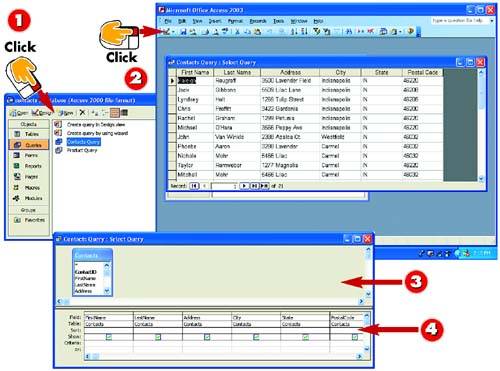If you are using a wizard to build a query, the query will be open, and you can simply switch to Design view. If you are modifying an existing query, you'll start from the database window, click the Queries option in the Objects bar, select the query you want to open, and then click the Design button. |
