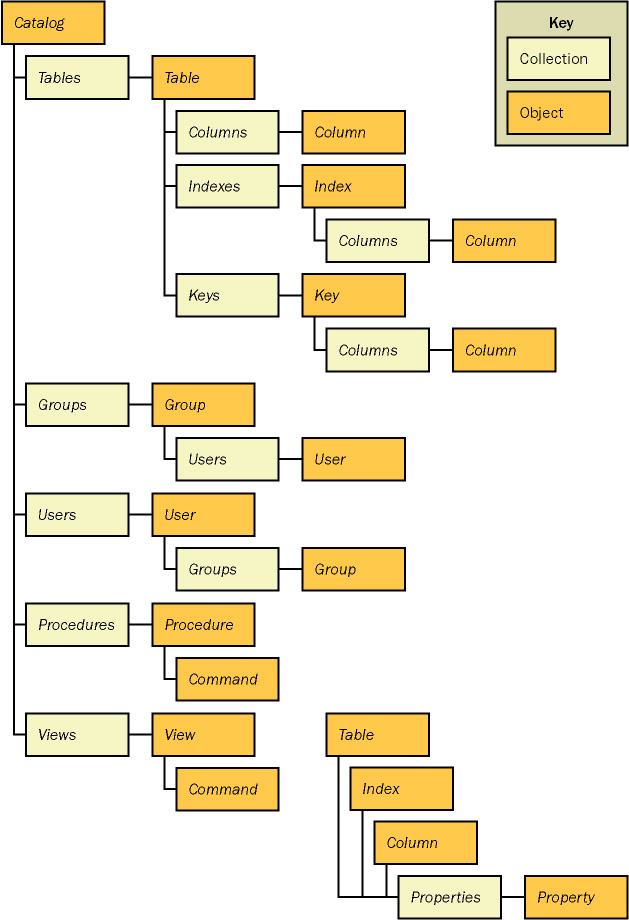 The ADOX library supports schema and security tasks. You can use this library to manage objects and thereby modify the architecture of your application's design. With the exception of the Catalog object, all objects in the ADOX library have matching collections. The catalog is the container of the elements within an Access database file. For example, within a Jet database there is a Tables collection of Table objects. You use ADOX collections to add and organize new objects in a catalog. Selected objects—such as a table, an index, a key, and a column—have a Properties collection. You use these Properties collections to manage the behavior of the objects within an application. You manage the Users and Groups collections to control permissions for other ADOX objects, such as tables, views, and procedures. Figure 3-1 shows an overview of the ADOX library.