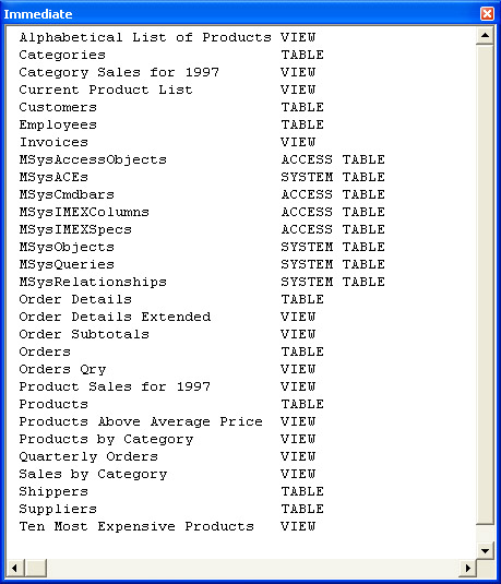 After its declarations, the second procedure instantiates a Catalog object and sets its ActiveConnection property to the path and filename passed from the first procedure. Next, the second procedure passes through the members of the Tables collection to compute the longest table name. This permits the next block of code to space content evenly across the Immediate window for any table name in the catalog. Figure 3-2 shows the output to the Immediate window from the Northwind database. Notice the first column lists many more tables than you normally see in the Database window when you open the Northwind database. The second column shows each table type. This enumeration lists all the table types in the Northwind database but not all possible table types. Review Table 3-1 for a complete list of the possible table types along with a brief description of each. Those tables with a TABLE type specification appear in the Database window by default. Recall from Table 3-1 that views are virtual tables. The term virtual table correctly conveys the notion that a view is not actually a table. Instead, it is a SQL statement that returns a rowset, which it can present in a datasheet—just like the rowset contained in a real table.