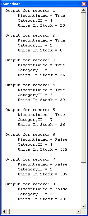 Figure 4-1 presents an excerpt from the output generated by running this code sample. This screen shot of the Immediate window shows the output from the last two records. The Northwind database contains 830 records in its Orders table, but the second procedure limits the rows processed to the first 10 rows. However, the procedure does print values for all the columns available on each row. Each row's output starts with a header label. Then, the procedure shows each column's name and value separated by an equal sign (=).