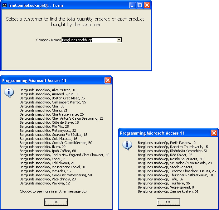 Private Sub cboLookup_AfterUpdate() Dim ctl1 As Control Dim cmd1 As Command Dim rst1 As Recordset Dim str1 As String 'Set reference to combo box control Set ctl1 = Me.Controls("cboLookup") 'Create and define command. 'Use combo box value in SQL string for command. Set cmd1 = New ADODB.Command With cmd1 .ActiveConnection = CurrentProject.Connection .CommandText = "SELECT Customers.CompanyName, " & _ "Products.ProductName, " & _ "SUM([Order Details].Quantity) AS TotalQuantity " & _ "FROM Products INNER JOIN ((Customers INNER JOIN Orders " & _ "ON Customers.CustomerID = Orders.CustomerID) " & _ "INNER JOIN [Order Details] ON " & _ "Orders.OrderID = [Order Details].OrderID) " & _ "ON Products.ProductID = [Order Details].ProductID " & _ "WHERE Customers.CustomerID = '" & ctl1.Value & "'" & _ "GROUP BY Customers.CompanyName, Products.ProductName;" .CommandType = adCmdText .Execute End With 'Create recordset based on result set from SQL string Set rst1 = New ADODB.Recordset rst1.Open cmd1, , adOpenKeyset, adLockOptimistic 'Loop through result set to display in message box(es) 'in blocks of 925 characters or less Do Until rst1.EOF str1 = str1 & rst1.Fields(0) & ", " & _ rst1.Fields(1) & ", " & rst1.Fields(2) str1 = str1 & vbCrLf If Len(str1) > 925 Then str1 = str1 & vbCrLf & "Click OK to see more " & _ "in another message box" MsgBox str1, vbInformation, _ "Programming Microsoft Access 2003" str1 = "" End If rst1.MoveNext Loop MsgBox str1, vbInformation, _ "Programming Microsoft Access 2003" End Sub