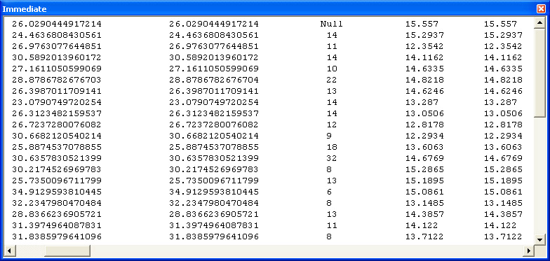 The first sample reads the entries from Excel, performs some calculations in Access, and prints the results to the Immediate window. After establishing a connection to the Excel data source, your application can programmatically treat the data source just like an internal Access table. For example, you can enumerate records in the table or compute values based on the entries in the record source. The sample prints to the Immediate window the existing entries in the Excel worksheet alongside the results of expressions computed in Access. This, incidentally, confirms that Access computations can generate results identical to those in Excel. This capability can reduce the amount of data that your application must read from a computationally intensive spreadsheet.