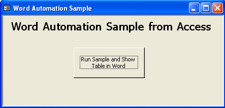 Figure 9-7 shows the frmAutomationSample Access form in the Chapter09.mdb file that lets users start the fromAccessToWordTable procedure by clicking a button. The code behind the form merely invokes the fromAccessToWordTable procedure for the button's click event. After the event procedure concludes, Word opens with a table of values from Access.