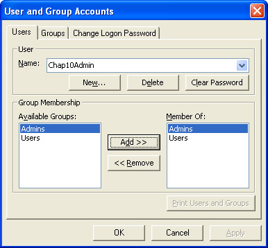 The next task in the first step involves designating a new administrator for the workgroup. Start the task by choosing Tools, Security, User And Group Accounts. You can start to create a new user to serve as an administrator by clicking New on the Users tab of the User And Group Accounts dialog box. In this example, I assigned Chap10Admin as the name and PMA11 as the personal ID for the user. Then, I used the arrows between the Available Groups and Member Of lists to add the Chap10Admin user to the Admins group. This completes the task of creating a new workgroup administrator named Chap10Admin. Figure 10-4 shows the User And Group Account dialog box after adding the new member to the Admins group.