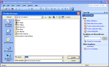 To open a new Access project for an existing database, click the Project Using Existing Data link on the Getting Started task pane. If you do not see the link, click the More link. The Task Pane opens by default when you start Access 2003. Clicking the Project Using Existing Data link opens the File New Database dialog box (see Figure 11-3). Access assigns a default name to the Access project file in the style of adpx.adp. You can override adpx with a custom name of your choice, and you can change the destination folder for the file by changing the selection in the Save In drop-down list. By clicking Create in the dialog box shown in Figure 11-3, the user creates an Access project with a filename of adp2.adp in the My Documents folder.
