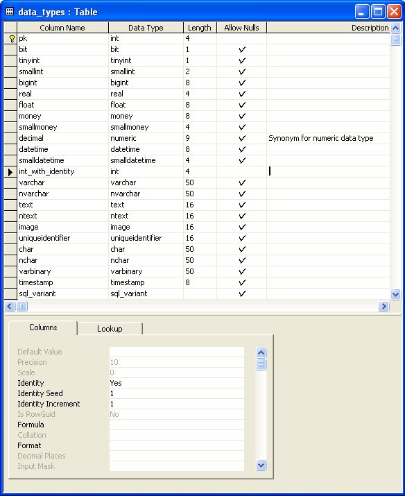 The specification for the data_types table shown in Figure 11-10 accepts the defaults for Length and Allow Nulls settings, with two exceptions. The first exception is the pk column. This column does not allow nulls. You can make a column the primary key (as you can with the pk column) by clicking the Primary Key button with the cursor resting on the row containing the column specification. The second exception is the column named int_with_identity. This column also does not accept nulls. Figure 11-10 shows the cursor resting on the row containing the specification for this column. As a result, the Columns tab offers additional column properties. In this case, you see the Identity setting equals Yes, and the default values of 1 for both the Identity Seed and Identity Increment settings. You can override these defaults by entering new values for the settings.