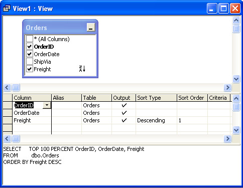 The Query Designer automatically adds the column name for a checked box to the middle panel, called the Grid pane. The Grid pane contains a row for each column in the view's virtual table. Note that you can designate the order in which the view sorts its records. Figure 11-14 shows the Freight column being sorted in descending order. Because the view has only one sort key, its Sort Order column has a value of 1 and the Sort Order values for the other columns are blank.