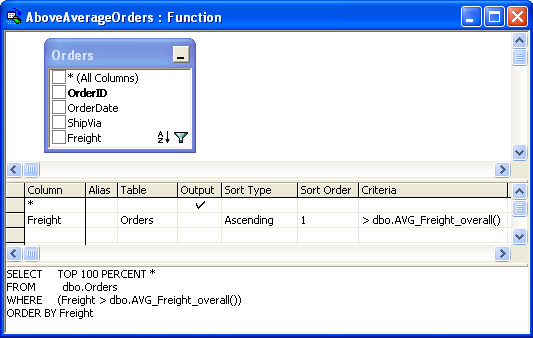 ALTER FUNCTION dbo.AboveAverageOrders () RETURNS TABLE AS RETURN ( SELECT TOP 100 PERCENT * FROM dbo.Orders WHERE (Freight > dbo.AVG_Freight_overall()) ORDER BY Freight )