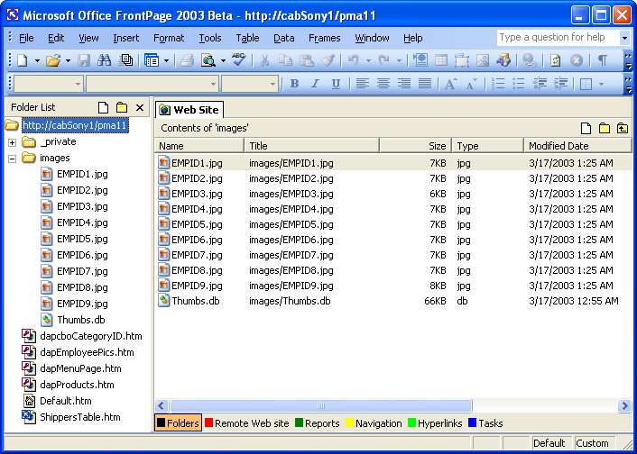 After copying the image files to this book's sample Web site, the images folder of the pma11 Web site has nine image files (plus one—thumbs.db—to facilitate the presentation of the images in a thumbnail view). The names for the image files range from EMPID1.jpg to EMPID9.jpg. Figure 14-10 shows the Folder List window with the Web Site tab to its right providing more detail on the image folder contents.
