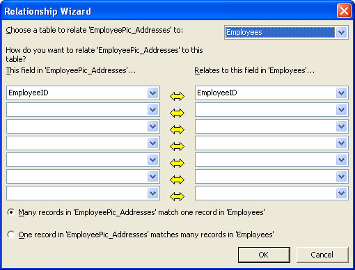 It will be helpful to show the URL for the image that the form will ultimately display. You can do this with a text box bound to the Pic_Address column in the EmployeePic_Addresses table. To add this text box to the page, select the text box with a ControlSource property setting of Extension. Selecting this text box enables Access to add a new text box below it. Then click the plus sign (+) to expand the EmployeePic_Addresses table in the Field List. Finally, double-click the Pic_Address column name. If the Layout Wizard dialog box appears, select Columnar and click OK. Access automatically opens a Relationship Wizard dialog box to link the EmployeePic_Addresses table to the Employees table. (See Figure 14-11.) Accepting the default setting is important for preserving the ability to update Employee table fields through the form on the page. The wizard specifies that the EmployeePic_Addresses table is in a one-to-many relationship with the Employees table and that the EmployeePic_Addresses table is on the many side of the relationship.