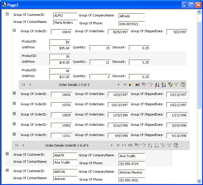 You can build multilevel reports from multiple record sources. Figure 14-14 shows a three-level report with CustomerID on the outer level, OrderID on the middle level, and fields from the Order Details table on the inner level. The complete report is available in this chapter's companion content. The standalone file is for the report dapThreeLevelReport.htm, which appears as dapThreeLevelReport in the Database window for Chapter14.mdb. This report design lets a user open the order details for any customer order. This interactive report depicted in Figure 14-14 shows the three line items for OrderID 10643 for the customer whose CustomerID is ALFKI. The figure displays the two inner navigation bars. The third outer navigation bar isn't visible in the figure. However, the outer navigation bar shows that there are 89 customers. This is two customers less than the number of rows in the Customers table since two customers have no orders.