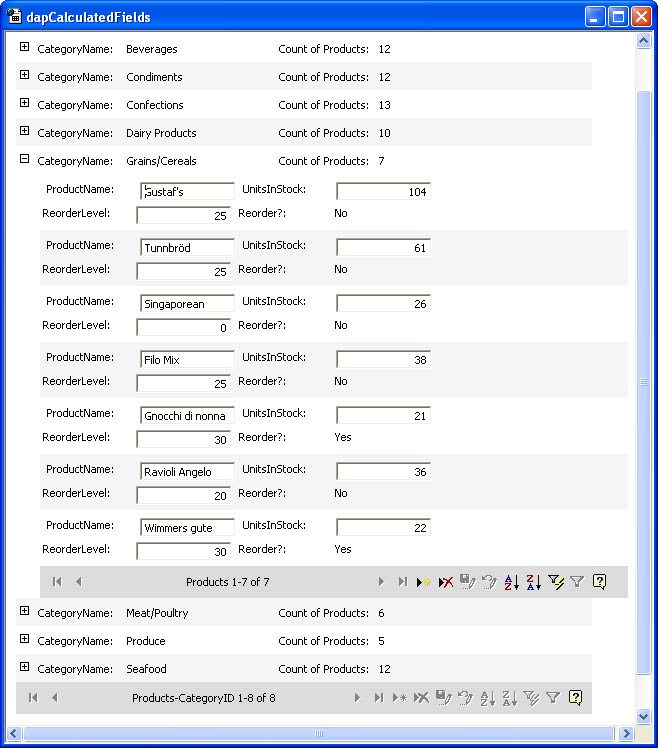 Notice that the report contains two navigation bars. The one with the label of Products 1–6 Of 6 is the inner navigation bar. This bar does not appear unless a user expands at least one CategoryID group. By default, the maximum number of records that the bar shows at one time is 10. You can increase or decrease this amount by using the Properties dialog box for the navigation bar. The outer navigation bar appears whenever the data access page opens. Again, all 8 category ID values show at one time since there are fewer than 11.