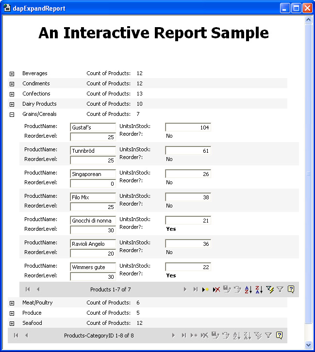 The report in Figure 14-16 illustrates the outcome of the enhancements to the dapExpandCategoryIDForProducts data access page presented in Figure 14-13. Notice that the labels describing the products within a category show the name of the category rather than a CategoryID code number. In addition, users can tell how many products are in a category without opening that category to get the information from the inner navigation bar. Finally, the report computes whether it's time to reorder a product and displays the results with a Yes or No.