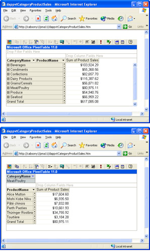Users can browse data access pages with PivotTable list controls and perform any desired analysis that you enable. For example, Figure 14-26 shows two different analyses in a browser window for the same basic PivotTable list control with the CategoryName, ProductName, and ProductSales fields on a data access page. The top browser window shows ProductSales aggregated by CategoryName. The bottom browser window presents a list of ProductSales by ProductName filtered by the Meat/Poultry category. Both PivotTable displays rely on the Sales by Category query that serves as the source for the PivotTable list control behind both browser windows.
