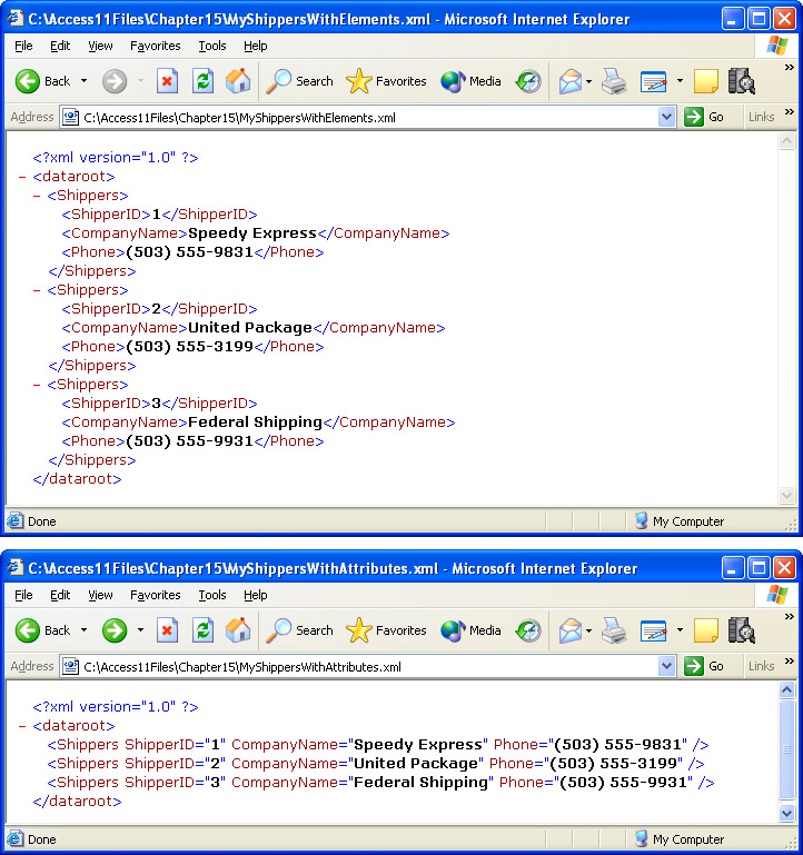 Figure 15-1 shows the MyShippersWithElements.xml and MyShippersWithAttributes.xml documents in a browser. The Internet Explorer browser has a built-in XML document viewer, which is based on its parser for XML syntax. Notice that the viewer automatically indents nested elements. For example, the Shippers element is indented relative to the dataroot element. Within the MyShippersWithElements.xml document, the ShipperID, CompanyName, and Phone elements are indented for each Shippers element. This indenting feature with Internet Explorer improves the clarity of a document's structure relative to viewing the same document in a basic text editor, such as Notepad. On the other hand, Internet Explorer does not enable the editing of an XML document unless you invoke the View, Source command, and save your changes. However, when choosing View, Source from a browser, the document's tags appear without any automatic indenting. Notice that elements in an XML document that have other elements within them appear with expand/contract controls to their left. All the controls in Figure 15-1 are fully expanded so they appear with a minus sign (-). However, you can collapse the nested elements by clicking the control. In a collapsed state, the control appears with a plus sign (+). The Internet Explorer XML document viewer converts all rows in MyShippersWithAttributes.xml document to a format with an embedded end tag, instead of the mixed use of the embedded end tag for the first two rows and an explicit end tag for the last row (as in the original document).