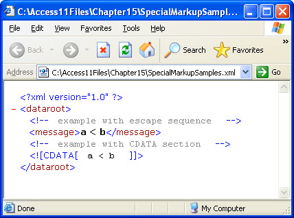 The SpecialMarkupSamples.xml file illustrates the syntax for representing special characters with either escape sequences or a CDATA section. The document also illustrates the syntax for a block comment marker. Figure 15-2 shows the document in a browser.