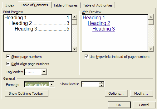 | 3. | Open the Table of Contents tab to set the options that are available for formatting the table of contents.