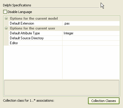 Configure options for Delphi code generation using the Delphi Specifications page of the Options dialog (select the Tools | Options | Source Code Engineering | Delphi menu option). The options you can specify include the: