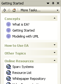 The Tasks Pane window provides access to a range of context-specific help topics, online resources and Enterprise Architect facilities to give you quick access to information and facilities in areas of interest in Enterprise Architect. When you first open Enterprise Architect, the Tasks Pane automatically displays on the right of the screen.