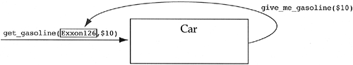 How does the ATM know the name of the CashDispenser object? In this case we will find that the actual relationship is one of containment, not uses. A jump of intuition is necessary to determine that ATMs contain as one of their data members an object of class CashDispenser. It knows the name of this data member implicitly; therefore, it can send it a message with no further work. We will see that many uses relationships are refined into containment relationships. Likewise, all containment relationships are first and foremost uses relationships. Many object-oriented gurus claim that finding uses relationships is an analysis activity while refining uses into containment constitutes a design activity; others disagree. Since we follow an iterative model of software development in the object-oriented paradigm, the line between analysis and design is blurred, leaving arguments along these lines solely for academic purposes. If a uses relationship is not a containment relationship, then how does the first object (the sender) know the name of the second object (the receiver)? Consider the relationship between a car and a gas station. It doesn't make sense to say that a car contains a gas station; however, cars do ask gas stations to give them gasoline. How does the car know the name of the gas station (see Figure 4.3)? There are five implementations of the uses relationship aside from using a containment relationship. Figure 4.3.