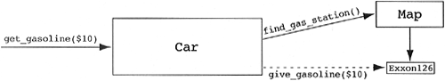 Another possibility is that the car asks a third-party class (a map) for the name of an appropriate gas station (see Figure 4.5). Of course, this only postpones our problem. How do we know the name of the map object? Figure 4.5. Car receiving gas station from a third-party class.