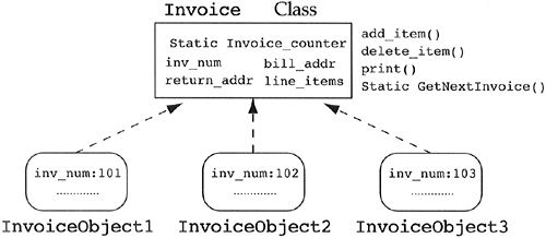In some multiparadigm languages such as C++, the implementation is to throw the class- and object-specific data and behavior in one bundle, namely, the class definition. There is no notion of a metaclass. The class-specific data and behavior are distinguished from the object-specific data and behavior via a language keyword. In the case of C++, the keyword is Static. This implementation does not offer the same lexical separation that is apparent in the metaclass solution, yet it serves the necessary purpose of implementing class-specific data and behavior (see Figure 8.2).