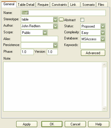 Once you have created your table, you can set its properties. Most table properties can be set from the Properties dialog, as described below. Some properties though must be entered as Tagged Values as described elsewhere, i.e. setting the value of the Table Owner and, for MySQL databases, setting the Table Options.