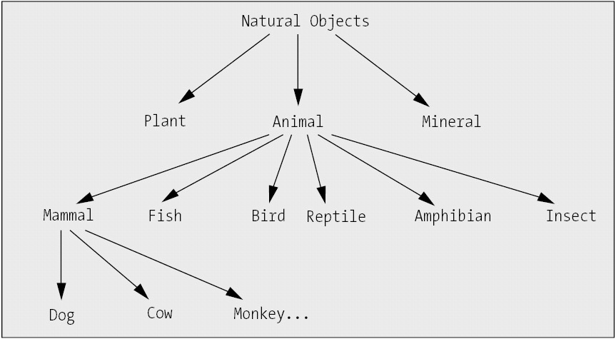 Given clear-cut rules such as these, placing an object into the appropriate category, or class, is rather straightforward. We can then "drill down," specifying additional rules that differentiate various types of animal, for example, until we've built up a hierarchy of increasingly more complex abstractions from top to bottom. A simple example of an abstraction hierarchy is shown in Figure 2-2.