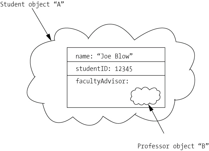 However, we often encounter the situation—as with the sample Student and Professor classes—in which an object A needs to refer to an object B, object B needs to refer back to A, and both objects need to be able to respond to requests independently of each other as made by the application as a whole. In such a case, handles come to the rescue! In reality, we are not storing whole objects as attributes inside of other objects; rather, we are storing references to objects. When an attribute of an object A is defined in terms of an object reference B, the two objects exist separately in memory, and simply have a convenient way of finding one another whenever it's necessary for them to interact. Think of yourself as an object, and your cellular phone number as your reference. Other people—"objects"—can reach you to speak with you whenever they need to, even though they don't know where you're physically located, using your cell phone number.