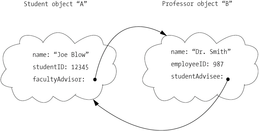 With this approach, each object is allocated in memory only once; the Student object knows how to find and communicate with its advisor (Professor) object whenever it needs to through its handle/reference, and vice versa.