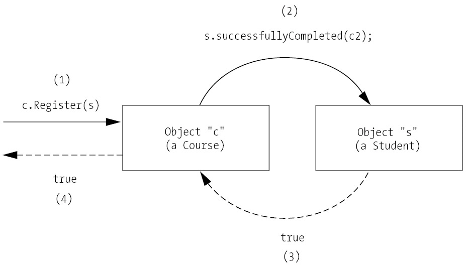 static void Main() { Course c = new Course(); Student s = new Student(); // Details omitted. // Invoke a method on Course object c. // (This is labeled as message (1) in the earlier figure; the returned // value, labeled as (6) in that figure, is being "ignored" in this // case.) c.Register(s); // etc. }