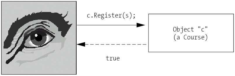 Given a reference s to a particular Student object, we are asking the Course object receiving this message to do whatever is necessary to register the student. In this case, we expect the Course to ultimately respond true or false to indicate success or failure of the registration request. |
