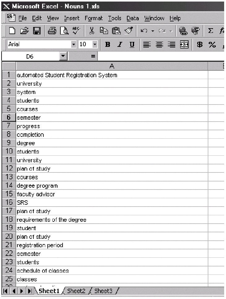 A simple spreadsheet serves as an ideal tool for recording our initial findings; just enter noun phrases as a single-column list in the order in which they occur in the specification. Don't worry about trying to eliminate duplicates or consolidating synonyms just yet; we'll do that in a moment. The resultant spreadsheet is shown in part in Figure 10-1.