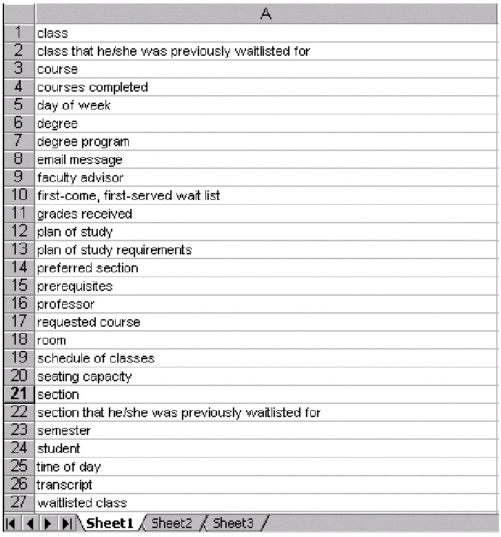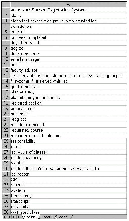 After you've typed all of the nouns/noun phrases into the spreadsheet, sort the spreadsheet and eliminate duplicates; this includes eliminating plural forms of singular terms (e.g., eliminate "students" in favor of "student"). We want all of our class names to be singular in the final analysis, so if any plural forms remain in the list after eliminating duplicates (e.g., "prerequisites"), make these singular, as well. In so doing, our SRS list shrinks to 38 items in length, as shown in Figure 10-2.