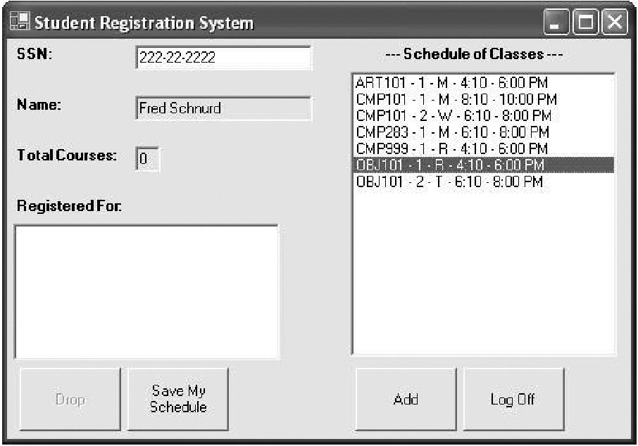 From Fred's vantage point (sitting in front of a computer screen!), here's what he perceives to be occurring: after logging on to the SRS, he indicates that he wishes to register for OBJ101, section 1 by choosing it from the available course list, and then clicks the Add button (see Figure 11-5).
