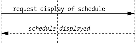 When Fred the user/actor requests that the semester class schedule be displayed, we reflect the message "request display of schedule" being sent to an anonymous ScheduleOfClasses object. The dashed-line-arrow response from the ScheduleOfClasses object indicates that the schedule is being displayed to the user, strictly speaking, via a GUI (see Figure 11-10).