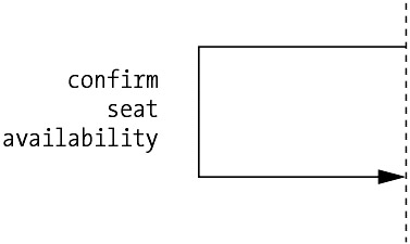 Assuming that both of these other objects respond favorably, as they are expected to do by virtue of how this scenario was written, the Section object then performs some internal processing to verify that there is indeed room for Fred in this section. We reflect internal processing within a single object as an arrow that loops back to the same lifeline that it starts with, as shown in Figure 11-11.